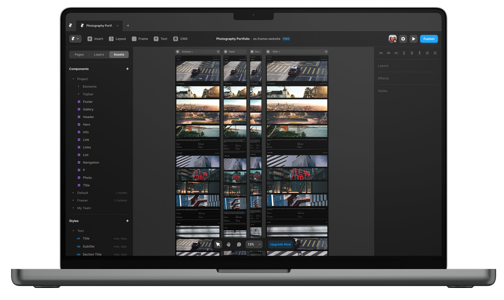 Build up for you or for your clients the perfect and ultra-modern photography portfolio without one single line of code with Framer.